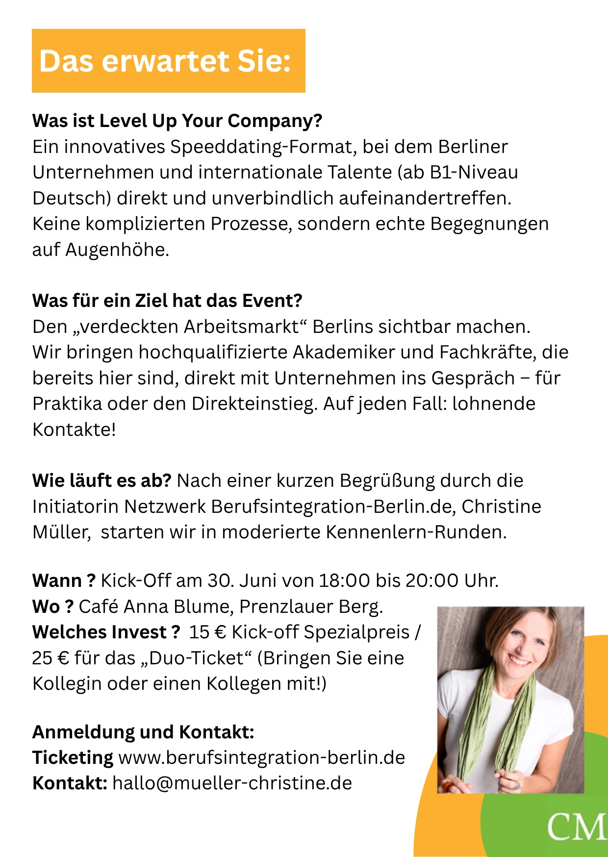 Mit meiner modularen Plattform Berufsintegration Berlin, schaffe ich strukturierte Netzwerktreffen. Das Speeddating-Format Level up your company bietet Raum für echte Begegnung von Berliner Unternehmen und internationalen Talenten.